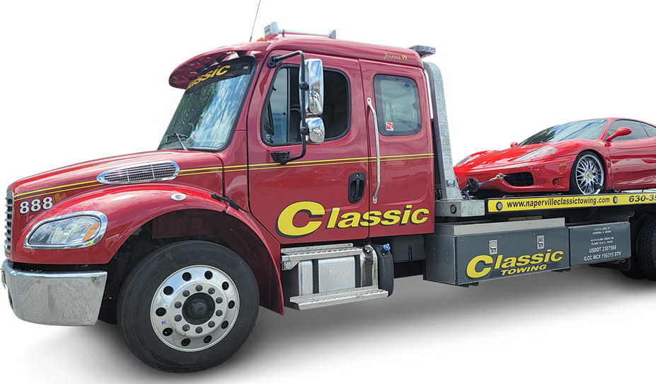 With Naperville Classic Towing’s Montgomery towing service, you will experience the latest, cutting edge towing and recovery technology with our eco-friendly, green emissions flatbed and wrecker style tow trucks. Our innovative, late model flatbed tow trucks in Montgomery have low profile LCG beds which sit much lower than standard flatbed tow trucks. These beds have the proper incline necessary to load vehicles with very low ground clearance without damaging the bumper, valance, or exhaust. To further ensure damage-free towing, we are also able to employ a soft nylon tie-down system with no hooks or chains to pull, bend, or scratch the vehicle. Classic car and high-end vehicle transport is one of our specialized areas of expertise in Montgomery, IL.